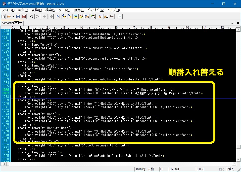 この部分は、Roboto(標準のフォント)にない文字を開く時(フォールバック時)にどのフォントを参照すればよいかを指定している所である。「CJK」に関する言語は、4種類あって、上から「zh-Hans」「zh-Hant,zh-Bopo」「ja」「ko」となっているはずである。どうもこの順番でフォールバックするらしく、故に日本語より順番が上の中国語にフォールバックしてしまうので、中華フォントが優先的に表示されるらしい。なので、「zh-Hans」と「zh-Hant,zh-Bopo」の上に「ja」を持ってくればよい。