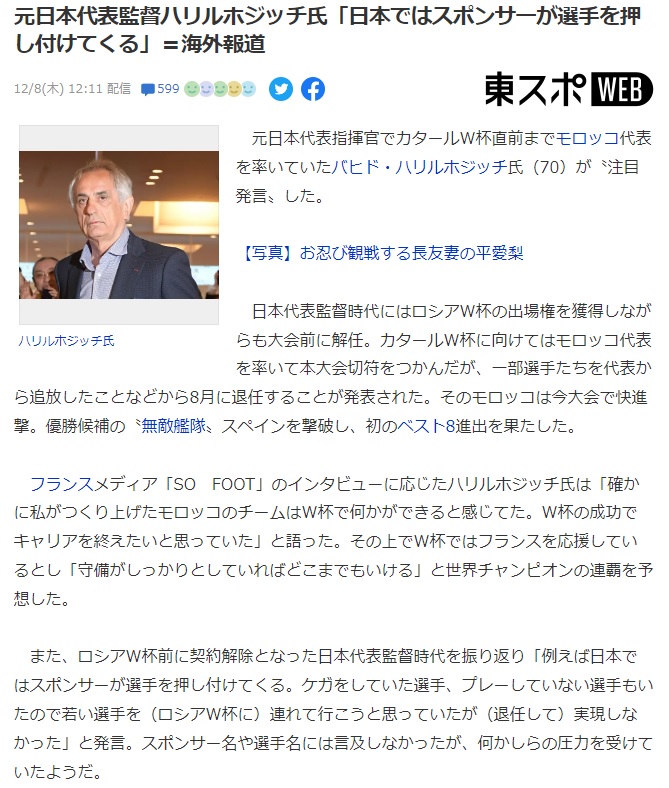 ちなみに、今回決勝トーナメントでスペイン、ポルトガルを立て続けに撃破してアフリカ初のベスト4に昇ってきたモロッコ代表はワールドカップ開催直前までこのハリルホジッチ監督が指揮をとっており、また、今回実力の割にそこそこ輝くことができた日本代表の戦術も、ハリルホジッチ監督が日本代表監督時代に掲げていた「中盤のデュエルで競い勝ち、そこからショートカウンター」という戦術そのものである(これはゆとりジャパンでは某中心選手が鈍足のために結果拒否→監督更迭となったものと思われる、と文章にすると本当だったらすごいことが当時噂されていましたよね・・・)。皮肉なものである。